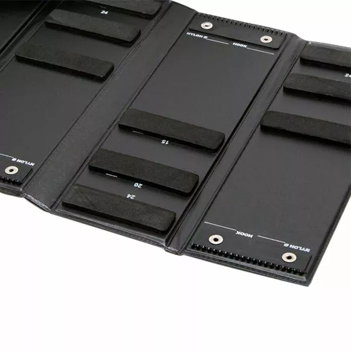 - Sections of soft foam hold hooks